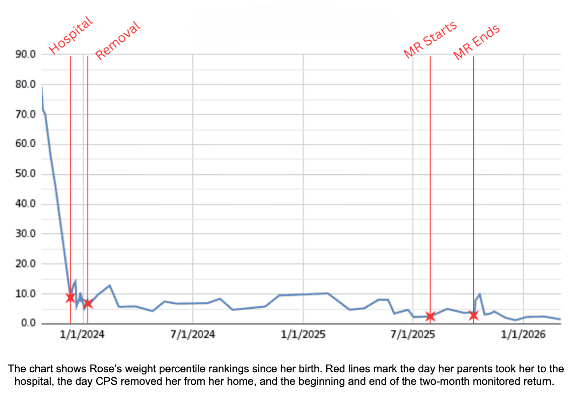 During the entire case, CPS continually misled the court and reported that Rose’s weight was healthy. By March of 2026, just two weeks before trial, Rose’s weight percentile had reached 1%–the lowest of her entire life.